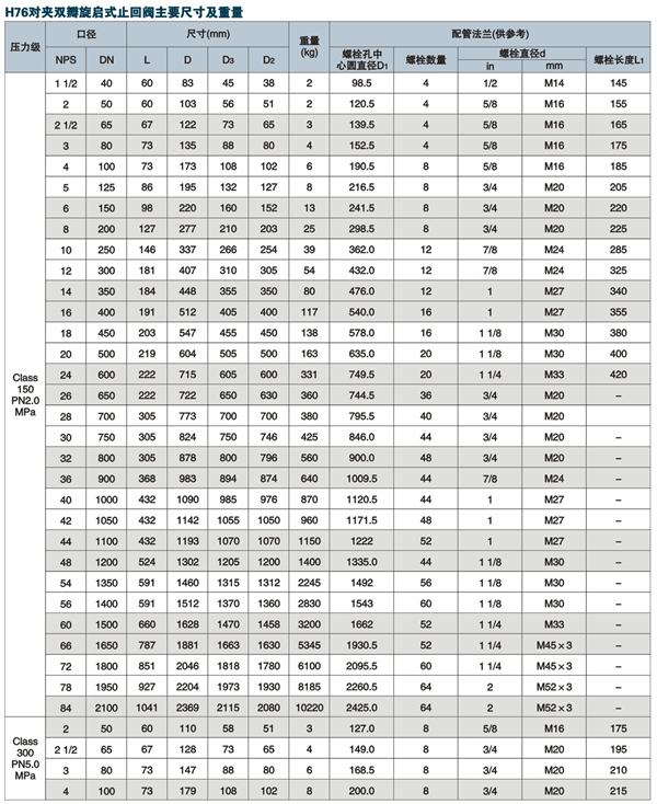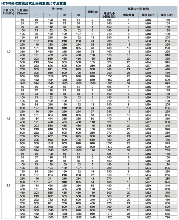 对夹式止回阀由阀体、阀瓣、阀轴、弹簧等组成,水平或垂直安装于管路系统,防止介质倒流。它具有结构短、体积小、重量轻;阀瓣关闭快速,防水锤;动作灵敏,密封性能好等特点。产品类型:H76X、H76Y、H76F、产品尺寸:DN50-600 压力等级:Class150~Class 300, PN16~PN40适用场合:水、海水、蒸汽、油品等介质适用温度:-29~200℃ 操作方式:自动。主体材质:铝青铜-B148 C95500, B148 C95800