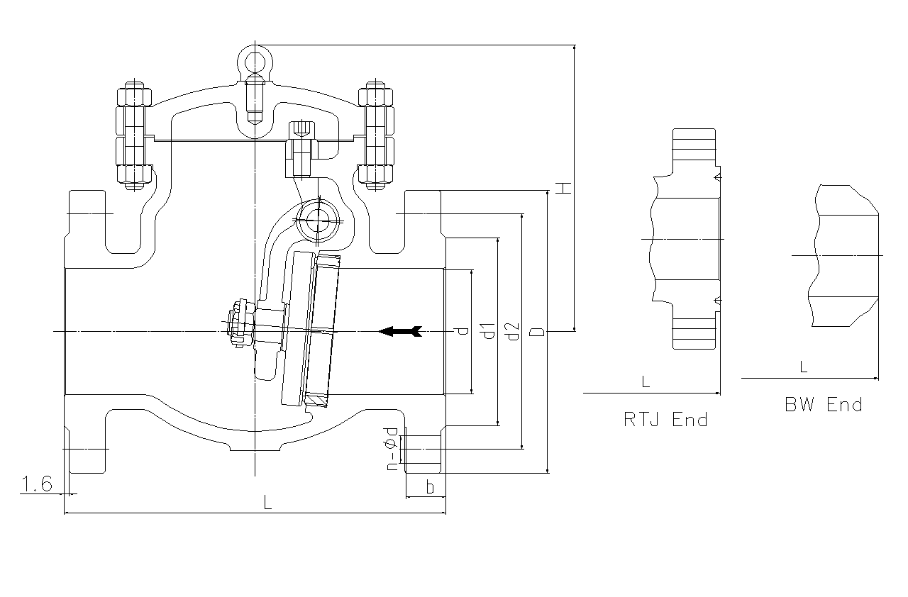 5、Class150-Class900止回阀阀体阀盖为螺栓结构,Class1500-Class2500的止回阀中法兰采用内压自密封结构,使得产品体积小,重量轻,密封可靠。